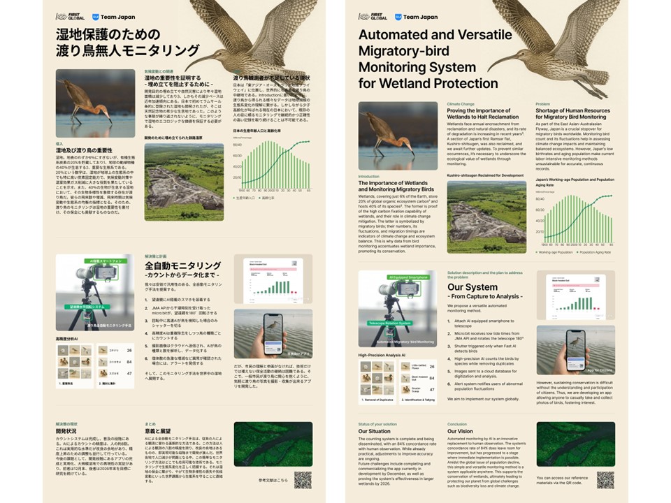 生物多様性の回復という課題に対して、NTEでは「干潟の野鳥の自動カウントシステムの開発」をテーマに、AI自動回転望遠鏡による渡り鳥のモニタリングシステムを提案。論文ポスターと2分動画(https://www.youtube.com/watch?v=s3e3fpBqbzE)を提出した。