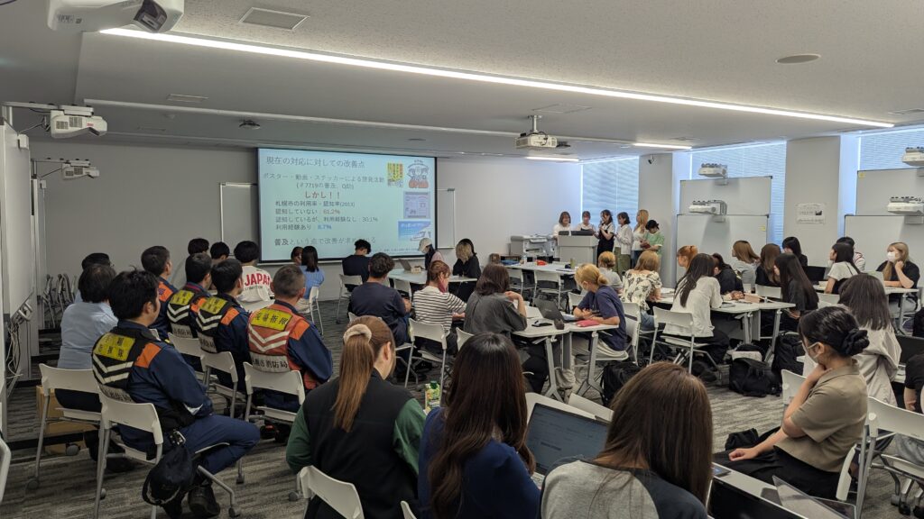 プログラム実施2年目となった2025年度には全1・2年生が対象となり、2年次履修の「課題発見解決法Ⅱ」がスタートした。この科目は混成クラスによる半年間のグループワークで、前期は7学科、後期は6学科の混成となり、80~90人のクラスが6つできる。1グループ5~6人の編成で1クラス16グループ。これを全学共通教育部教員1名と学科教員1名がペアを組んで担当する。カリキュラム前半の「大学の魅力発信」というウォームアップワークでポスター発表まで行った後は、以前よりキャリア教育で連携関係にあった北海道中小企業家同友会や道内広域の自治体の協力のもと地域課題に取り組む。1クラスにつき異なる業種の組織2つが割り当てられ、実情や課題の詳細を30分程度ヒアリングしたうえでグループワークに入る。プレゼン発表時には、課題を提出した組織の担当者も学生の提案を聞き、直接コメントやフィードバックを行う。