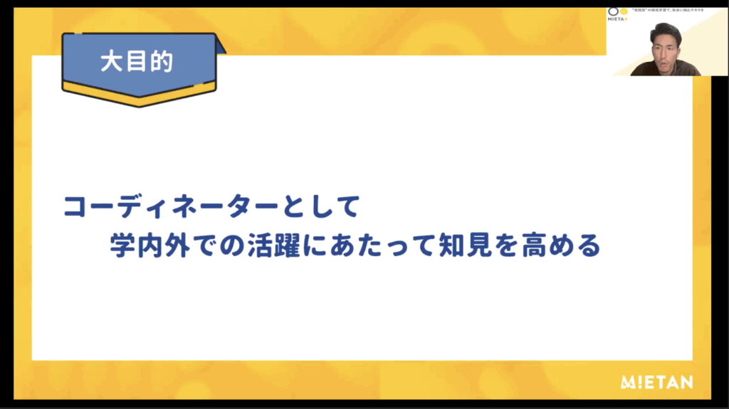 2024年8月、ミエタは全国の中学・高等学校の教職員および教育に関心のある一般の方を対象に、授業計画を担う探究コーディネーターの育成およびコミュニティ創出を目的とした研修を、対面で1日、オンラインで2日、「基礎講座」と名付けて開催した。内容は3日とも同一で、参加者はそのうち午前1回、午後1回の講座を受講することにより基礎講座を修了し、希望者は「応用講座」へと進むことができる。また受講後はオンラインも含め、参加者同士の交流や、情報共有などができる場も設定した。しかし、金氏は初回の講座が始まった途端にわずかな違和感を覚え、すぐに軌道修正をしたという。