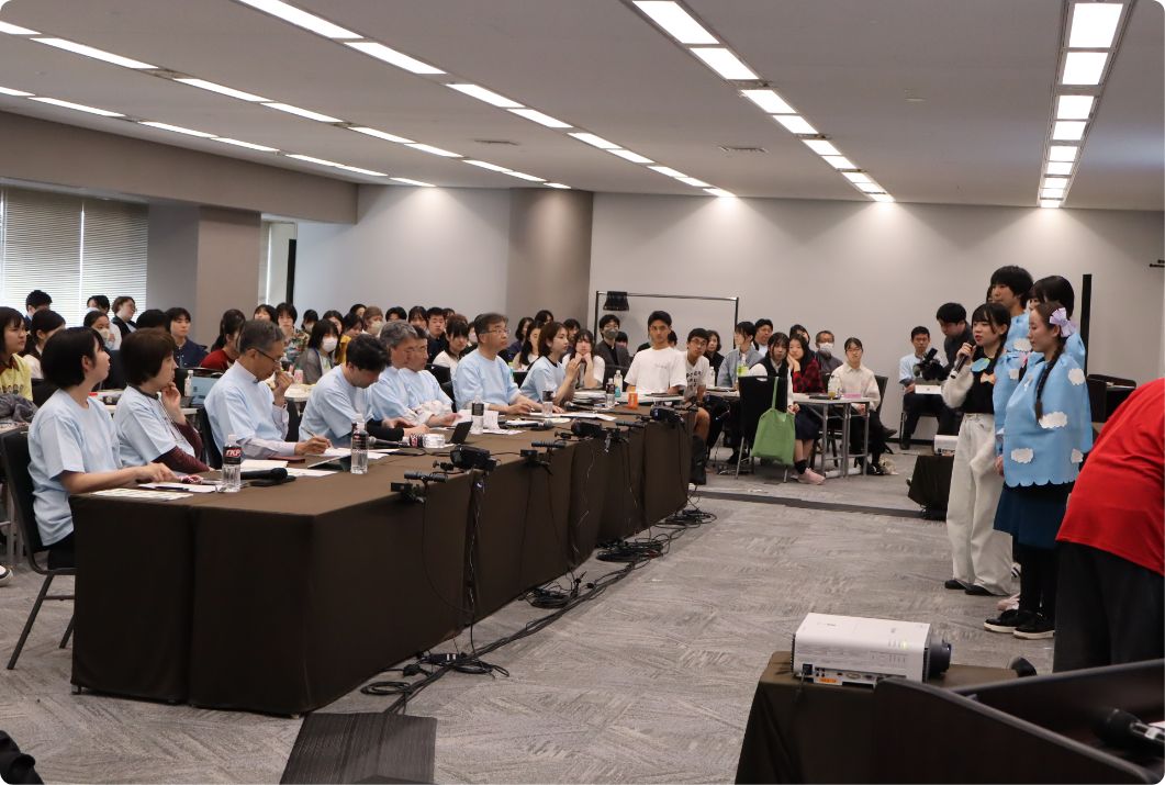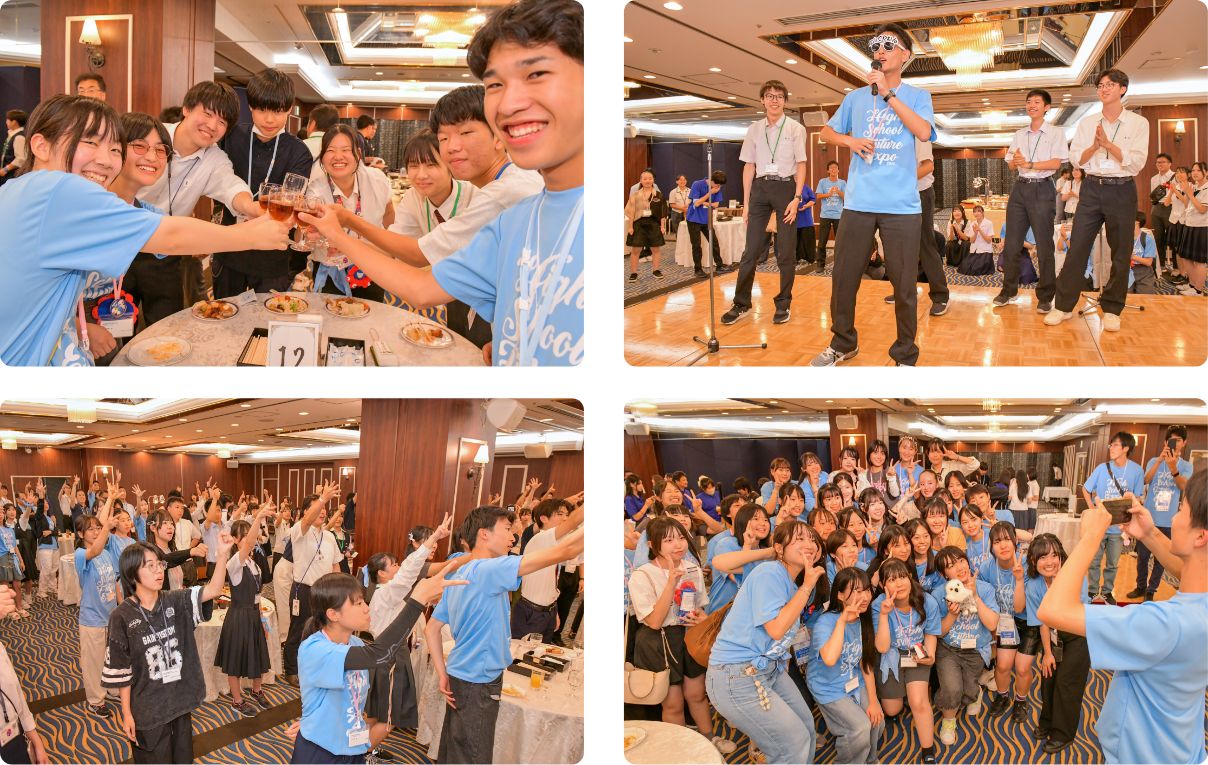 シャインハットでの熱気をそのままに、ホテルに戻った高校生たちは懇親会で再び盛り上がりました。この1年間の努力を称え合いながら、交流を深める場となった懇親会は、イベント部が企画した催しが盛りだくさん。会場中央に設けられたステージでは、ゲームやじゃんけん大会が行われ、歓声や笑い声が絶えない会となりました。初めて言葉を交わす高校生同士も、自然とその熱気に引き込まれ、以前からの仲間のように打ち解けていきました。