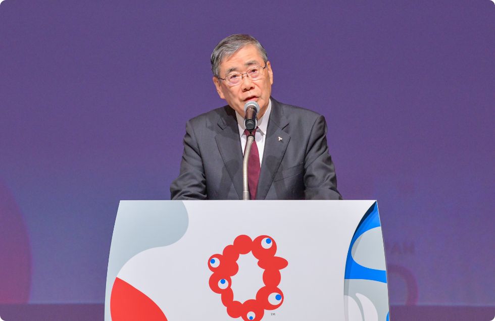 いよいよEXPOホール「シャインハット」で始まった「三菱みらい育成財団 高校生MIRAI万博」。開会にあたり、財団理事長の宮永俊一が挨拶を行いました。財団設立の意義や経緯に触れつつ、日本の高校生の探究活動を広く社会に伝えたい、他校や社会とのつながりを生む機会を作りたいという現場の先生方の声が、万博開催の契機となったことを説明しました。最後に、来場者や視聴者に向けて「高校生たちの真剣な眼差しと熱意あふれる挑戦を通じて、未来への芽吹きを感じていただければ幸いです」と呼びかけ、開会のご挨拶とさせていただきました。