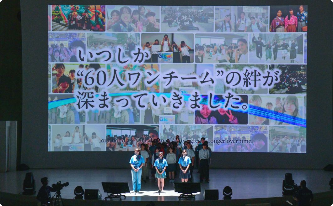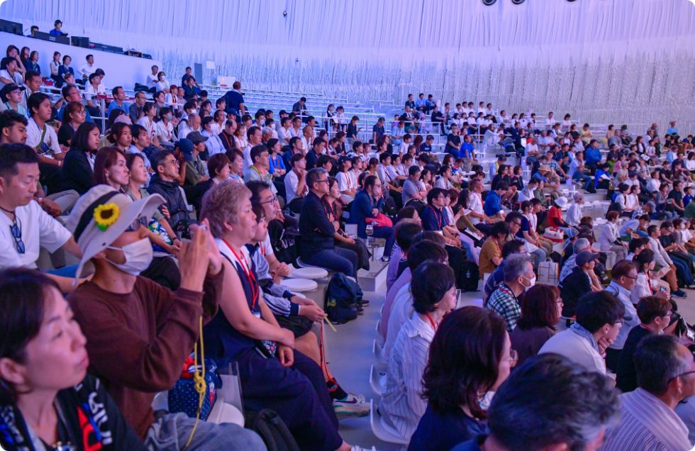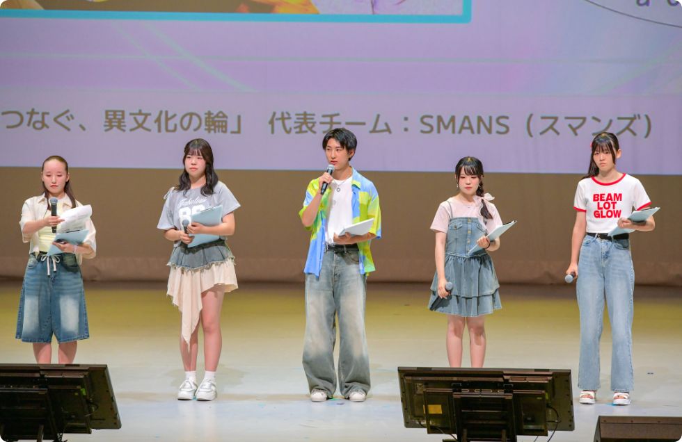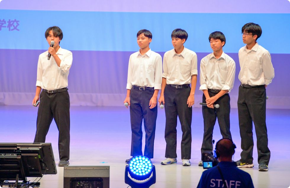 第2部では、全国の助成対象校の高校生から選抜された60名が5人1組12チームをつくり、3回の合宿や期間中の活動を通して、「高校生による世界への発信」をテーマに、提言やメッセージを練り上げてきました。2025年3月の発表・審査会で代表3チーム、特別賞として1チームを選出。その他のチームのメンバーはイベント部とプロモーション部に分かれ、本番まで「60人1チーム」を合言葉に、世界に向けて高校生からのメッセージを発信しました。当日は高校生や来場者、関係者を含め、約1900人の方にご参加いただきました。この日のために1年間準備を重ねてきた全157人の生徒たちの当日の様子をご紹介します。