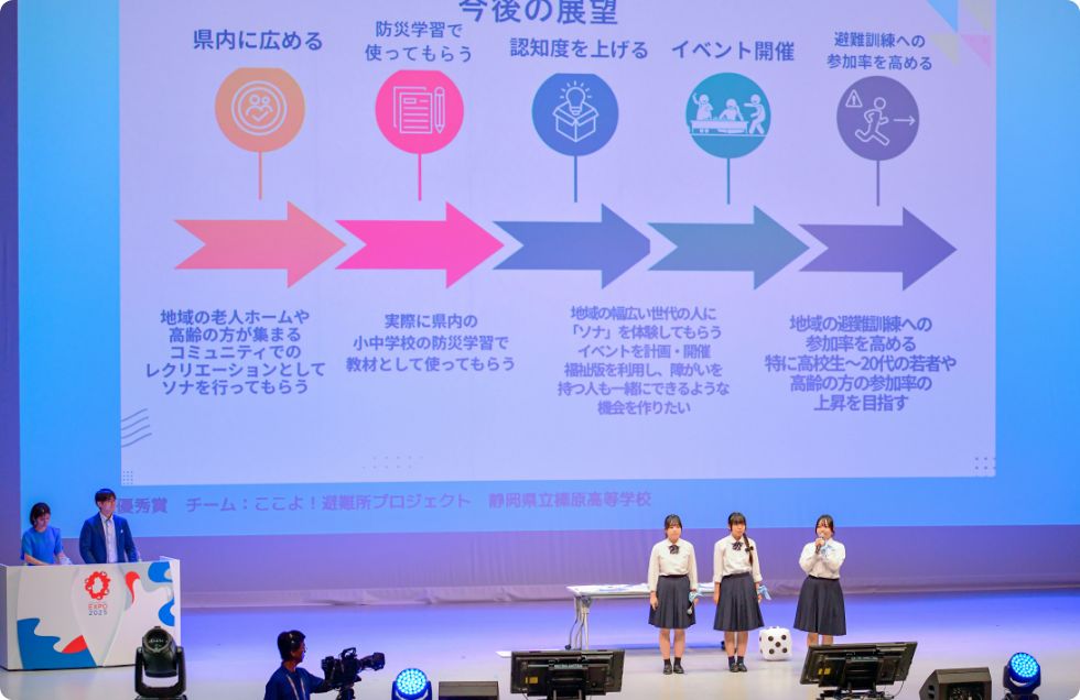 第1部には、2024年に全国74校・364チーム、約1万4000人もの方々からご応募をいただきました。1次審査を通過した100チームを対象に、2025年3月にはオンライン選考会を実施。そこで最優秀賞6チーム、優秀賞4チームを選出し、選ばれたチームの皆さんには万博に向けてプレゼン内容をさらに磨き上げていただきました。