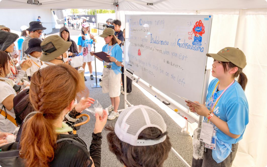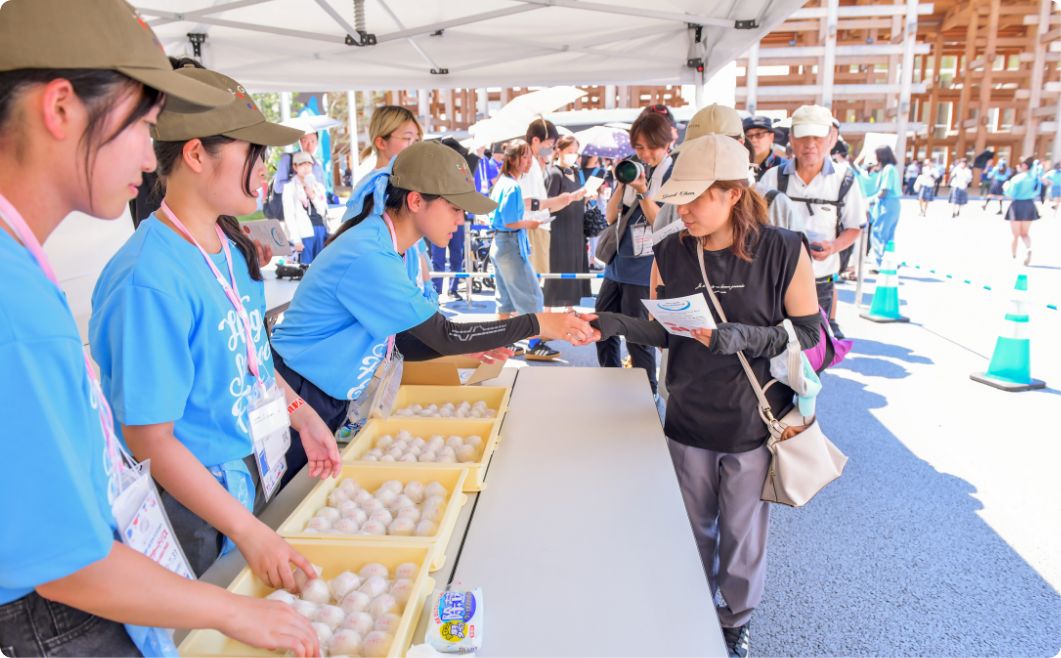 万博では、真夏の開催を考慮し、特定原材料28品目を使用せず、さらにイスラム教のハラルにも対応した冷凍の「いちご大福」を地元の和菓子店と協力して開発。300個を無料で提供しました。シャインハット前には長蛇の列ができ、お渡しした皆さまには、召し上がっていただきながら、これまでの取組みや開発の経緯を紹介。最後にメンバーが「同じ味を同じ場で同じ時間に共有できたことをうれしく思います。それでは一緒に『ごちそうさま』を言いましょう」と呼びかけると、全員で「ごちそうさまでした!」と声を合わせて挨拶。「おいしかったよ!」「ありがとう!」といった感謝の声も飛び交い、大盛況のうちに「完食」となりました。
