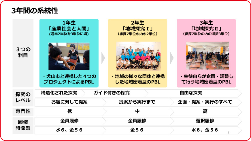こうした教科横断型のさまざまな学びを実践する場として機能するのが、「地域探究」と称して、PBLを軸に3年間を通じて系統立てて行われる探究活動だ。1年生は犬山市役所と連携して地域課題の学習を行い、探究活動に必要な一連のステップを体験する。2年生は8テーマ42チームに分かれ、地域の企業や団体と連携して地域密着型プロジェクトを行う。3年生になると生徒自らが自由に企画・調整して行うPBLを展開している。