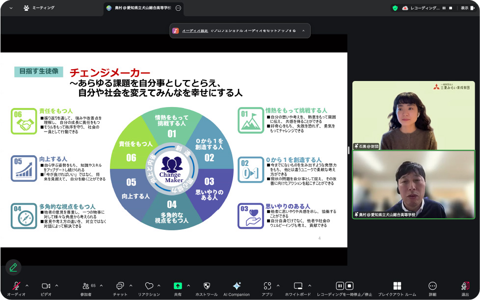 犬山総合高等学校の奥村教頭から同校での取組みをご紹介いただいた後に、司会の石黒との対話が行われました。