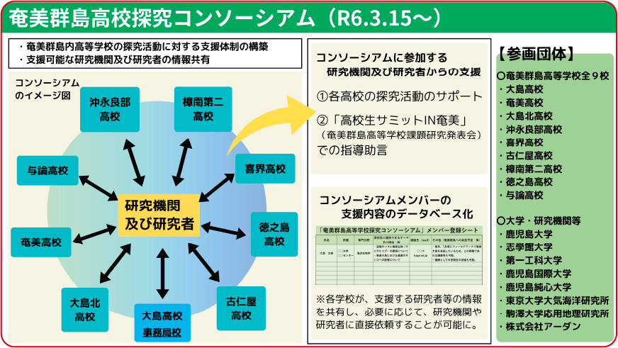 奥村 探究学習を進めていく上で、大学との連携は大事ですが奄美には大学がない。さらに言えば、我々は公務員ですので転勤があります。属人的ではなく組織同士として大学とつながることができないかと考え、来島していた東京大学大気海洋研究所に相談してみたところ、「奄美の高校全てがまとまってくれれば」という話になりました。これは必ずできると思って、コンソーシアム構想を企画し、次の日には、中渡瀬先生をはじめ、探究学習の担当者を集めて話をして生まれたのが、研究者のデータベースを作るというアイデアです。校内で話し合った1週間後に、群島全ての高校の校長が集まる会があり、お話ししたところ、ものの5分もしないうちに「それはいい、やろう」と、皆さんが言ってくれました。