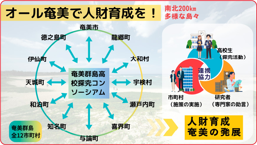 また、高校間の交流促進を目的に「高校生サミットIN奄美」という研究発表大会も2023年に創設した。群島内の9高校だけでなく、県外のSSH校や大学教授も招待。地域からの支援も広く呼び掛けた結果、2024年度には18団体からの協賛、35団体からの後援を得る一大イベントに成長した。こうした一連の取組みは外部からも高く評価され、独立行政法人 教職員支援機構(NITS・ニッツ)が主催するNITS大賞を受賞。こうした成果により、奄美群島全12市町村で構成される奄美群島広域事務組合からの補助金交付も決定し、研究者のデータベースも全自治体と共有することになった。もともとは、一つの学校の課題解決から始まった取組みが、高校、自治体、研究者が三位一体となった地域ぐるみの人財育成と地域振興の取組みへと発展していった。